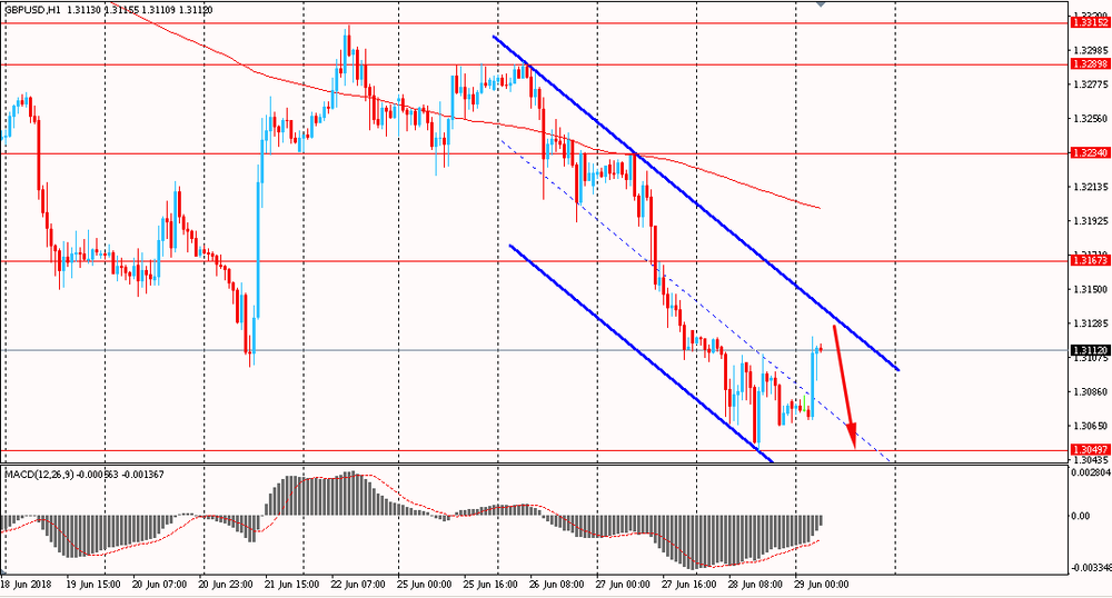 Пара GBP/USD сегодня утром выросла к $1.3120, отступая от вчерашнего минимума. В четверг пара снижалась и упала к линии поддержки нисходящего канала, закрыв день на отрицательной территории. На данный момент фунт сумел уверенно закрепиться выше срединной линии тренда и сейчас приближается к его сопротивлению. Медведи продолжают контролировать ситуацию.