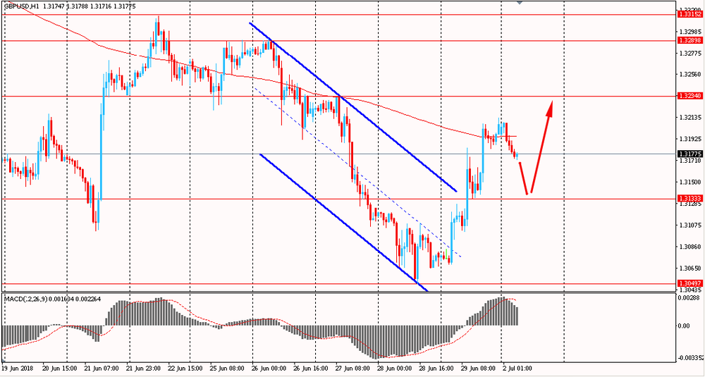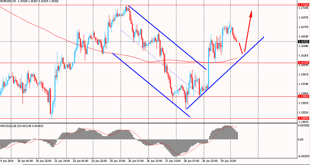 Пара EUR/USD сегодня утром торгуется в диапазоне $1.1655-80, продолжая оставаться около пятничного максимума. В последний день прошлой торговой недели пара пробила сопротивление нисходящего канала и закрыла день уверенным повышением. На данный момент евро удалось закрепиться выше линии скользящей средней MA 200 H1 и сейчас быки пытаются развить успех. Как и говорилось, единая валюта вышла из общего нисходящего канала в северном направлении и сейчас пара находится выше линии поддержки от 28 июня под контролем быков.