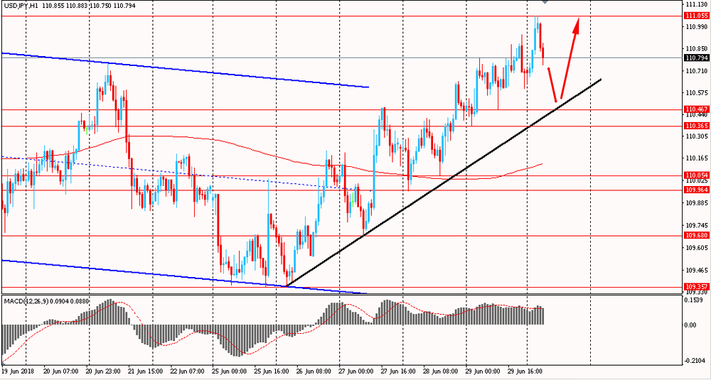 Сегодня утром пара USD/JPY резко выросла к Y111.05, продолжая пятничный подъем. В четверг и пятницу пара, оттолкнувшись от линии поддержки последних 4-х дней, выросла и смогла завершить день на положительной территории. На данный момент USD/JPY уже закрепилась выше линии скользящей средней MA 200 H1 и выше сопротивления общего нисходящего канала. Пока пара находится выше поддержки от 26 июня - быки удерживают преимущество. Однако, стоит отметить, что на часовом графике сформировалась медвежья дивергенция по индикатору MACD, что сигнализирует о возможном формирование глубокой коррекции или развороте цен.