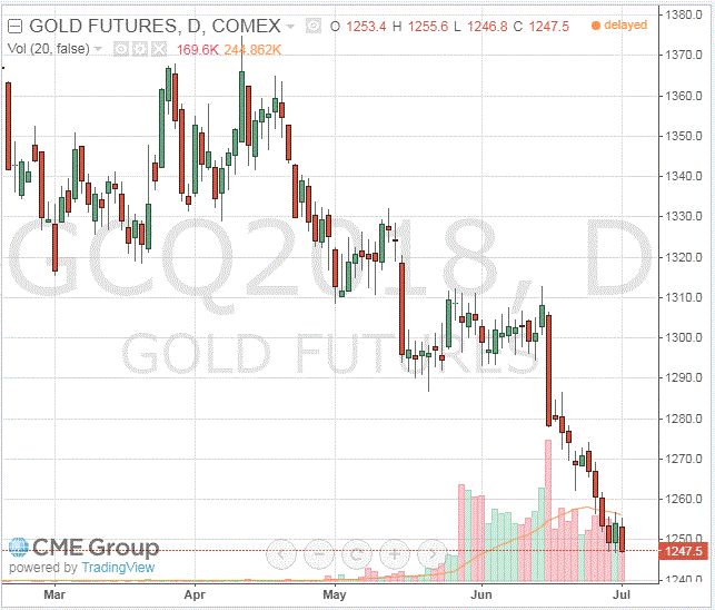 Стоимость августовского фьючерса на золото на COMEX снизилась до $1247,50 за унцию.