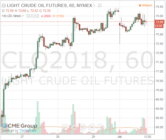 Стоимость августовских фьючерсов на американскую легкую нефть марки WTI (Light Sweet Crude Oil) упала до 73,69 доллара за баррель на Нью-йоркской товарно-сырьевой бирже.