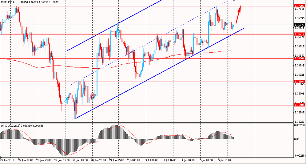 Пара EUR/USD сегодня утром торговалась в узком диапазоне $1.1680-95. В четверг пара, оттолкнувшись от линии поддержки канала, выросла и закрыла день на положительной территории. На данный момент евро все еще торгуется в рамки общего восходящего канала от 28 июня. Пара все еще торгуется выше линии скользящей средней MA 200 H1. Скорее всего быки будут пытаться продолжить общий подъем и закрепить свои позиции выше срединной линии канала.