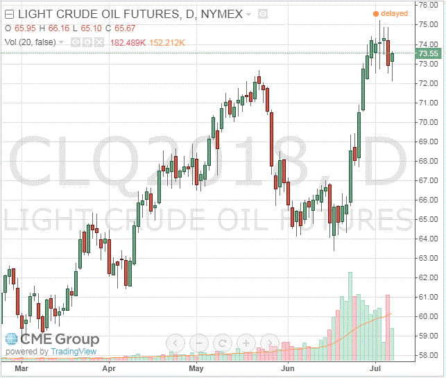 Стоимость августовских фьючерсов на американскую легкую нефть марки WTI (Light Sweet Crude Oil) выросла до 73,55 доллара за баррель на Нью-йоркской товарно-сырьевой бирже.