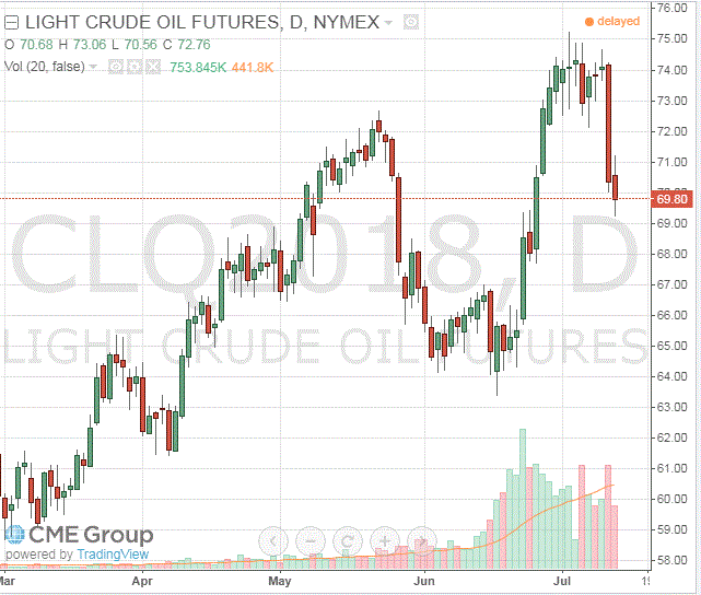 Стоимость августовских фьючерсов на американскую легкую нефть марки WTI (Light Sweet Crude Oil) упала до 69,80 доллара за баррель на Нью-йоркской товарно-сырьевой бирже.