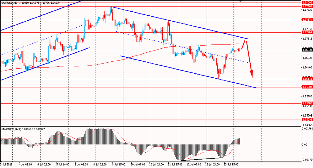 Пара EUR/USD сегодня утром торговалась в диапазоне $1.1675-85. В пятницу пара падала в первой половине дня, однако, коснулась нижней линии поддержки общего нисходящего канала и во второй половине дня выросла, закрыв день на положительной территории. На данный момент, несмотря на коррекцию, евро все еще находится ниже линии скользящей средней MA 200 H1 и ниже наклонной линии общего нисходящего канала от 9 июля. Пока евро будет находится ниже данного сопротивления - необходимо придерживаться медвежьего сценария. Стоит отметить, что на часовом графике сформировалась небольшая бычья дивергенция по индикатору MACD, что сигнализирует о возможном формирование глубокой коррекции или развороте цен.