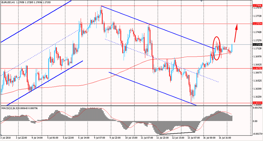 Пара EUR/USD сегодня утром торговалась в диапазоне $1.1700-15, оставаясь около вчерашних максимумов. В понедельник пара выросла и смогла закрыть день на положительной территории. На данный момент евро пытается закрепиться выше линии сопротивления нисходящего канала от 9 июля и выше линии скользящей средней MA 200 H1. Если пара удастся это сделать - то нисходящий тренд по паре можно будет считать завершенным и необходимо будет искать позиции на продажу пары.