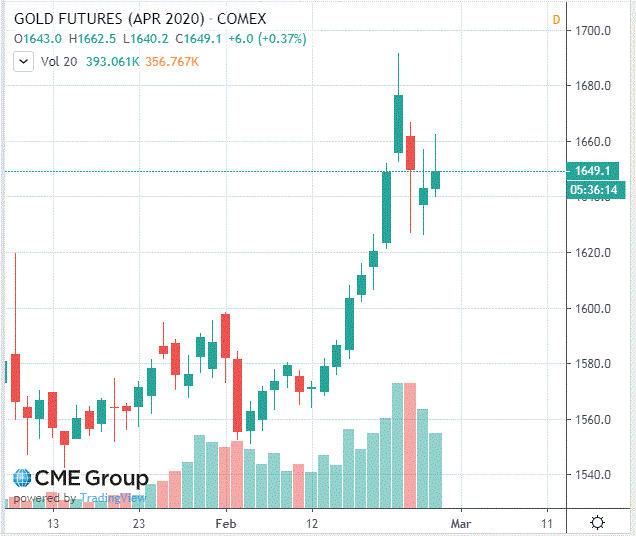 "Глобальная паника вокруг вспышки коронавируса тянет фондовые рынки вниз, в то время как все средства уходят в безопасные гавани ... есть несколько мест, где можно спрятаться, и золото - одна из лучших альтернатив", - сказал Хусейн Сайед, главный рыночный стратег FXTM.