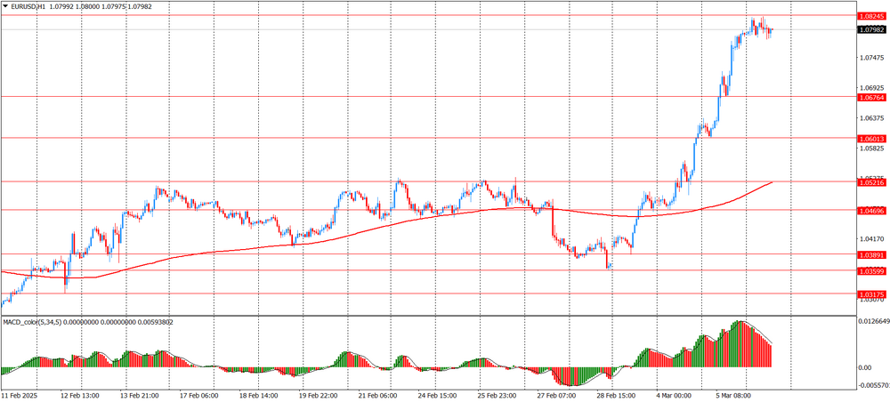 There is a steady uptrend on the EUR/USD hourly chart today. The pair is trading near a 4-month high. The price broke through several key resistance levels and gained a foothold above 1.0800, reaching a local maximum of 1.0825. The MA (200) H1 moving average line (1.0520) is below the price, which confirms the uptrend. The MACD histogram shows a slowdown in the upward momentum: the histogram is decreasing, which may indicate a correction. The main trend remains bullish, but a short-term correction to support levels is possible. Consolidation above 1.0825 may open the way to new highs. In case of a pullback, the nearest targets are 1.0675 and 1.0600.