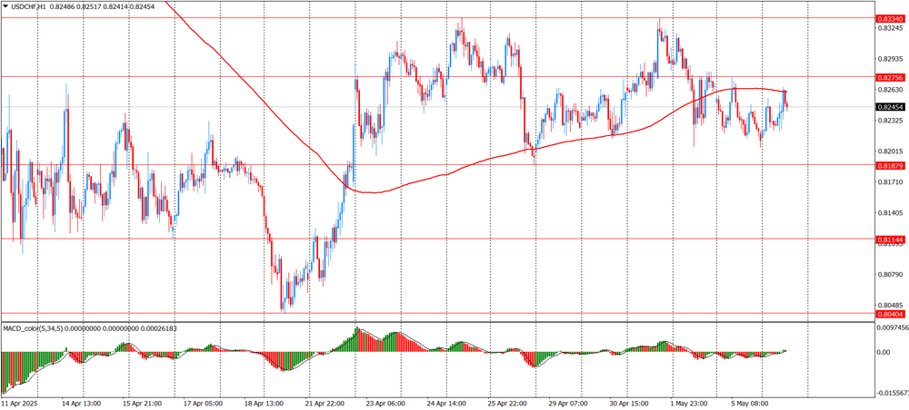 Today, on the hourly chart, USD/CHF is consolidating near the 0.8245 level after an unsuccessful attempt to break through the resistance at 0.8275. The price remains under pressure from the MA (200) H1 moving average, which acts as a dynamic resistance and holds back growth. The upward momentum that was observed after the sharp reversal on April 21 has weakened, and now the pair is trading in a sideways range between the levels of 0.8190 and 0.8275. The MACD indicator remains near the zero line, without giving a clear signal about the direction, which confirms the absence of a pronounced trend at the current stage. A breakdown above 0.8275 may open the way to the next resistance at 0.8335, while a move below the 0.8190 support will increase pressure on the pair and may lead to a decline towards 0.8115. In general, the current price action indicates a phase of uncertainty, and the future direction will depend on the breakdown of one of the key levels.