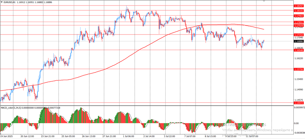 On the hourly chart, the EUR/USD pair shows a consolidation phase after the previous growth, followed by a decline. The price formed a local maximum in the area of 1.1829, after which a downward correction began, which continues to the present moment. Currently, the quotes are trading below the 200 moving average (red line), which has a downward slope, which confirms the predominance of "bearish" sentiment.