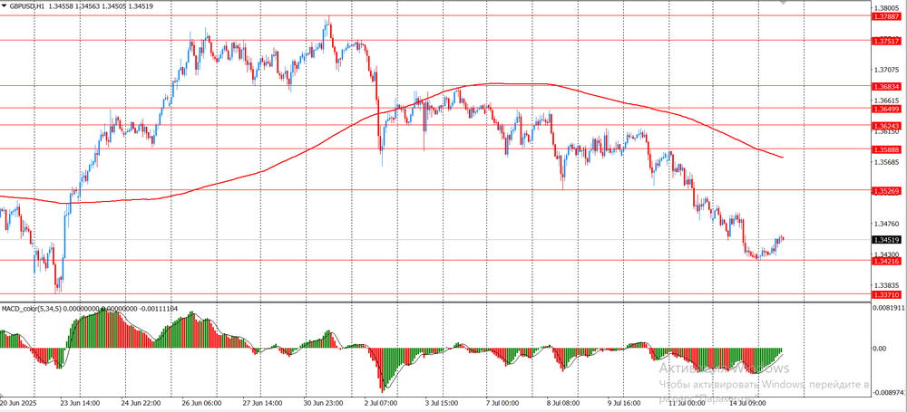 The hourly chart of the GBP/USD pair shows a strong downward movement, starting from a peak near the 1.3800 level and gradually falling to support levels near 1.3420. The price is steadily moving below the moving averages, which indicates the predominance of a bearish trend. The MACD indicator shows an expanding red histogram, reinforcing the bearish sentiment, and there is no signal of a possible reversal. In the near future, the downward trend is expected to continue while maintaining pressure below the resistance levels located approximately in the range of 1.3550-1.3680.