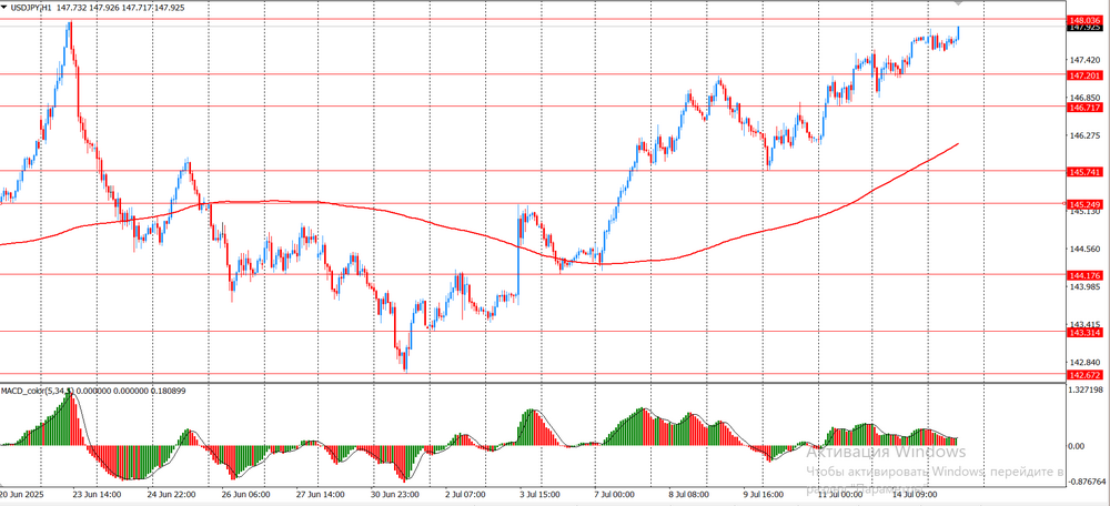 There is a pronounced upward trend on the hourly chart of the USD/JPY pair, which is still continuing and is confirmed by a steady price movement above the moving average line, which indicates the dominance of bullish sentiment. After a slight corrective decline to the level around 143.50-143.30, the price began to rise again, updating local highs. The MACD indicator shows a positive histogram, supporting the idea of an upward movement and indicating the strength of the buying side. In the near future, it is possible to continue growth and test the resistance level around 148.00, after which the movement towards new highs may continue. In the event of a correction when approaching the level of 147.00—147.50, there is a possibility of a temporary downward pullback, however, the general scenario remains bullish.
