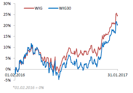 The first hour of today's trading has brought improvement in the climate on European markets, including Warsaw. The reading of the dynamics of Polish GDP surprised slightly positive and was amounted (according to preliminary estimates) of 2.8% compared to the expected level of 2.7%. Stronger was the consumption and investment decline has slowed, which sounds well for the start of this year. The most important is that in the first three quarters of the previous year GDP growth has surprised negatively, and now we have a positive message.
