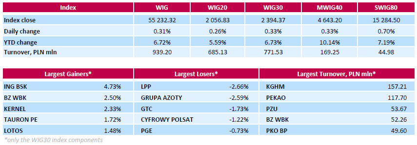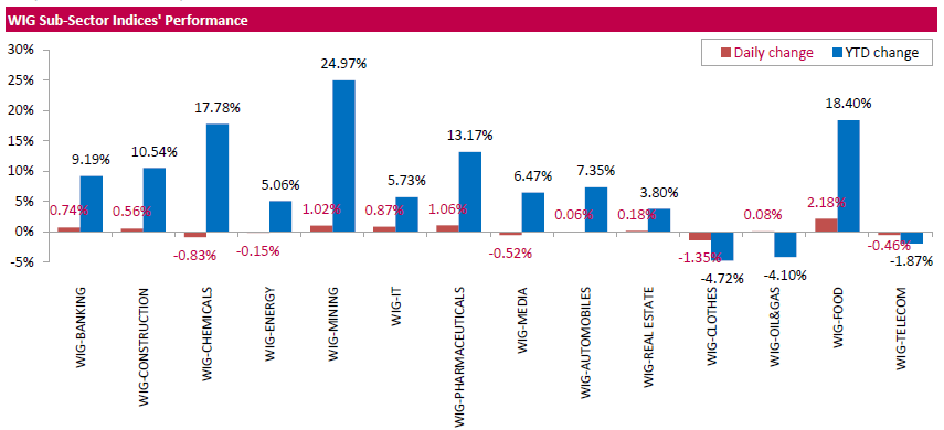 Polish equity market closed higher on Tuesday. The broad market measure, the WIG index, added 0.31%. Sector-wise, food stocks (+2.18%) fared the best, while clothes sector names (-1.35%) fell the most.