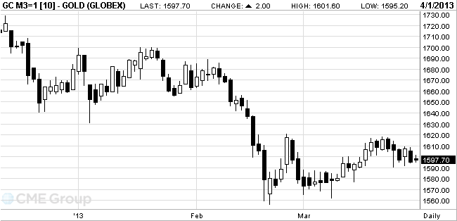 Цены на золото стабильны, в то время как основные биржи Европы закрыты в связи с праздником, а инвесторы уже менее обеспокоены ситуацией с Кипром. В первом квартале золото подешевело на 4 процента в связи с ралли на фондовых рынках и ослаблением евро.