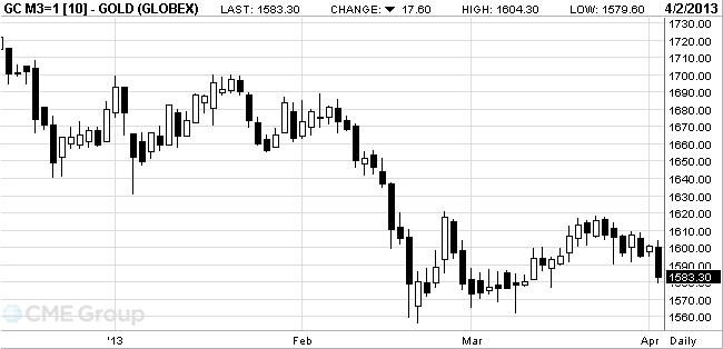 Стоимость июньского фьючерса на золото на COMEX сегодня упала до 1579.6 доллара за унцию.