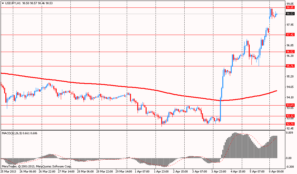 Иена упала до более чем трех-летнего минимума против евро, после того как премьер-министр Японии Синдзо Абэ заявил, что снижение курса иены оказало общее положительное воздействие на экономику страны. За предыдущих три дня иена упала на 6,4% против доллара, после того, как Банк Японии принял беспрецедентное решение увеличить выкуп гособлигаций до 7,5 трлн иен в месяц, тогда как консенсус-прогноз аналитиков составлял 5,2 трлн иен. Кроме того, ЦБ, который несколько недель назад возглавил новый председатель Харухико Курода, яростный сторонник активного смягчения денежно-кредитной политики, пообещал выйти на целевой уровень инфляции в 2% за два года. Курса Y100 иен за доллар не было уже с апреля 2009 года.