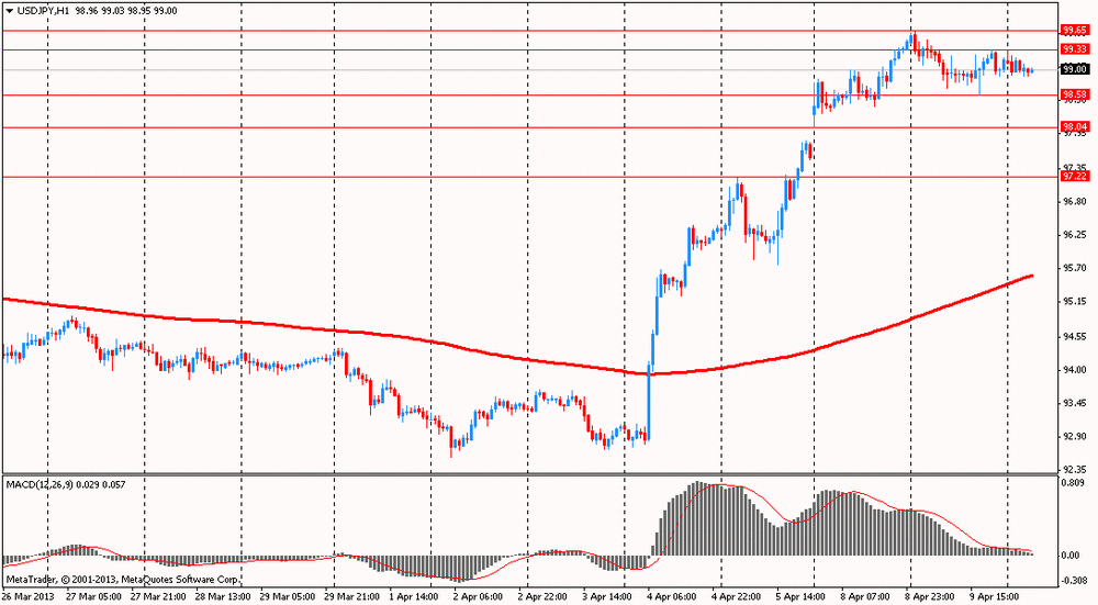 Иена упала против большинства основных валют, после того как премьер-министр Японии Синдзо Абэ заявил, что снижение курса иены оказывает общее положительное воздействие на экономику страны. По итогам заседания ЦБ, которое состоялось 4 апреля, Банк Японии принял беспрецедентное решение увеличить выкуп гособлигаций до 7,5 трлн иен в месяц, тогда как консенсус-прогноз аналитиков составлял 5,2 трлн иен. Кроме того, ЦБ, который несколько недель назад возглавил новый председатель Харухико Курода, яростный сторонник активного смягчения денежно-кредитной политики, пообещал выйти на целевой уровень инфляции в 2% за два года. На данный момент японская валюта торгуется на 1-но процентном расстоянии от курса Y100 иен за доллар, впервые с апреля 2009 года.
