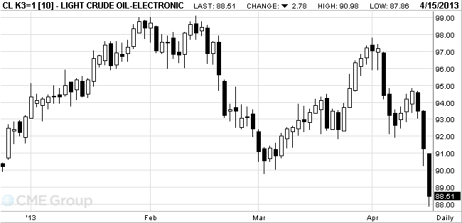 Цены упали ниже $90 после того, как Национальное бюро статистики сообщило, что в первом квартале в Китае валовой внутренний продукт увеличился на 7,7% по сравнению с годом ранее. Это меньше, чем прогнозные 8% и 7,9% роста в четвертом квартале. Кроме того, данные бюро статистики показали, что потребление нефти в Китае в марте было наименьшим за последние пять месяцев.