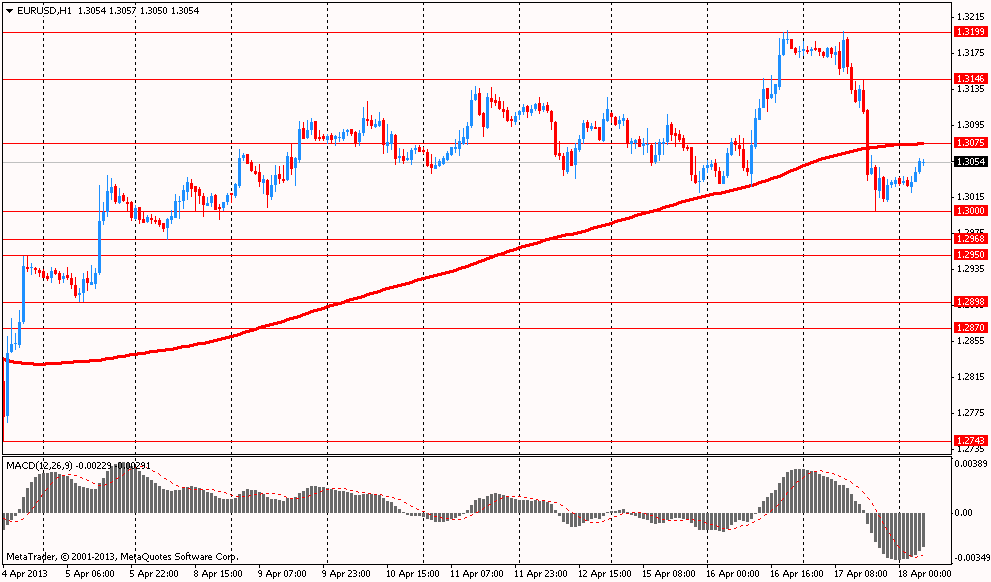 Также сегодня в Японии вышли данные по дефициту торгового баланса. В марте 2013г. показатель составил 3,7 млрд долл., что почти в два раза меньше показателей февраля этого года. Однако мартовский дефицит торгового баланса означает, что уровень импорта в Японию превышает объемы экспорта девятый месяц подряд, что является наиболее длительным периодом с 1980г. За год экспорт в США вырос на 7%, а в Китай, наоборот, снизился на 2,5%. Стоит отметить, что эксперты предполагают, что уровень японского экспорта в ближайшие месяцы возрастет из-за девальвации курса иены на фоне масштабных вливаний в экономику со стороны Банка Японии.