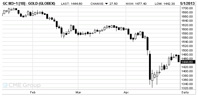 Стоимость июньского фьючерса на золото на COMEX сегодня снизилась до 1444.60 долларов за унцию.