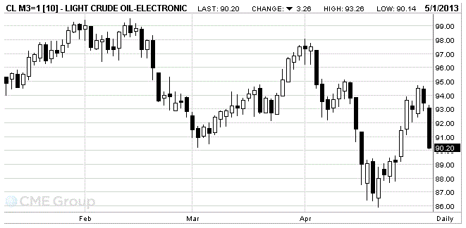 Стоимость нефти снизилась более чем на 3%, опустившись ниже уровня $100, поскольку опасения по поводу экономического роста в Китае и Соединенных Штатах и наращивание запасов нефти в США ослабило перспективы спроса. Заметим, что по итогам апреля цены на нефть снизились на 7%, показав самое крупное за падение за 11 месяцев, на фоне того, что многие показатели указывают на то, что мировая экономика остается в состоянии дефицита.