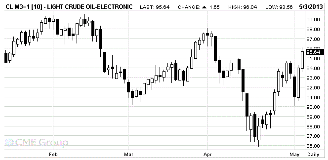 Стоимость июньских фьючерсов на американскую легкую нефть марки WTI (Light Sweet Crude Oil) выросла до 95,64 доллара за баррель.