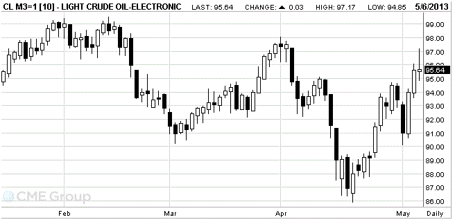 Стоимость июньских фьючерсов на американскую легкую нефть марки WTI (Light Sweet Crude Oil) выросла до 95,64 доллара за баррель, самого низкого внутридневного уровня с 19 декабря.