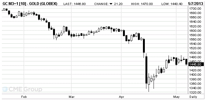 Стоимость июньского фьючерса на золото на COMEX сегодня снизилась до 1446.80 долларов за унцию.