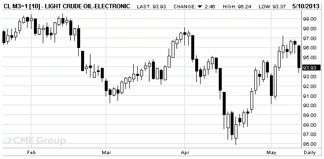 Стоимость июньских фьючерсов на американскую легкую нефть марки WTI (Light Sweet Crude Oil) упала до 93,93 доллара за баррель.