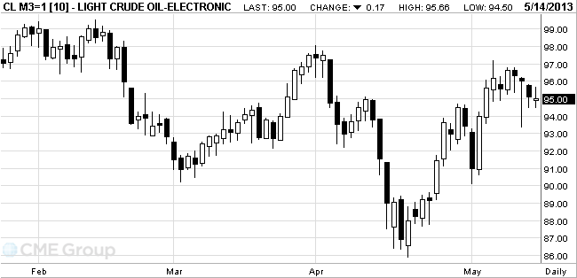 Стоимость июньских фьючерсов на американскую легкую нефть марки WTI (Light Sweet Crude Oil) упала до 94,50 доллара за баррель, а потом выросла до 95,66 доллара за баррель на Нью-Йоркской товарной бирже.