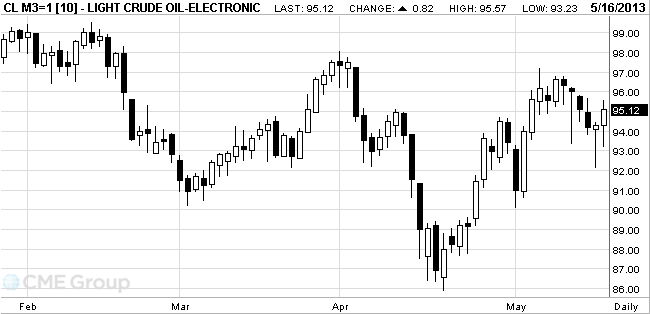 Стоимость июньских фьючерсов на американскую легкую нефть марки WTI (Light Sweet Crude Oil) выросла до 95,57 доллара за баррель на Нью-Йоркской товарной бирже.