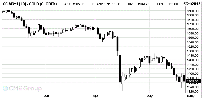 Стоимость июньского фьючерса на золото на COMEX сегодня упала до 1365.60 долларов за унцию.