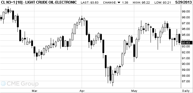 Стоимость июльских фьючерсов на американскую легкую нефть марки WTI (Light Sweet Crude Oil) упала до 93,21 доллара за баррель на Нью-Йоркской товарной бирже.