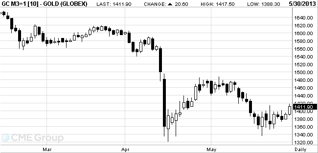 Стоимость июньского фьючерса на золото на COMEX сегодня выросла до 1417.50 долларов за унцию.