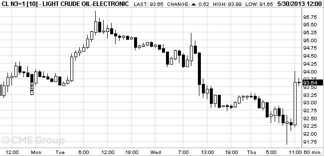 Стоимость июльских фьючерсов на американскую легкую нефть марки WTI (Light Sweet Crude Oil) упала до 91,65 доллара за баррель и после выхода отчета о запасах выросла до 93,99 доллара за баррель на Нью-Йоркской товарной бирже.