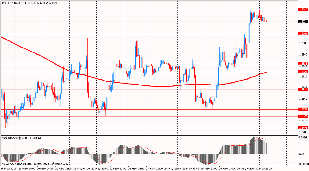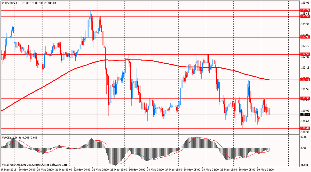 Иена упала против всех основных валют, на фоне снижения уровня инфляции. Уровень потребительских цен в Японии упал в апреле на 0,4% в годовом выражении. Продолжающаяся в стране дефляция ставит под сомнение возможность достижения целевого уровня инфляции Банка Японии в 2%. Это может подтолкнуть Банк Японии к еще большему расширению стимулирующих монетарных программ. Не помогло иене удержать свои позиции даже то, что объем промышленного производства в Японии вырос в апреле 2013 года на 1,7%. Результат превзошел консенсус прогноз аналитиков, который составлял 0,5%, что является признаком более быстрого восстановления экономики Японии, чем предполагалось. Рост промышленного производства продолжается в Японии уже пятый месяц подряд.