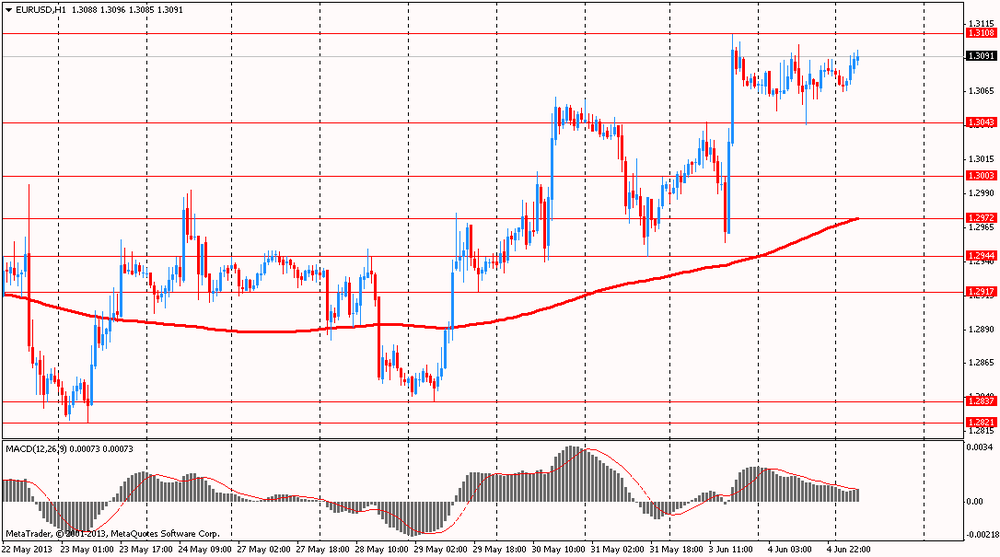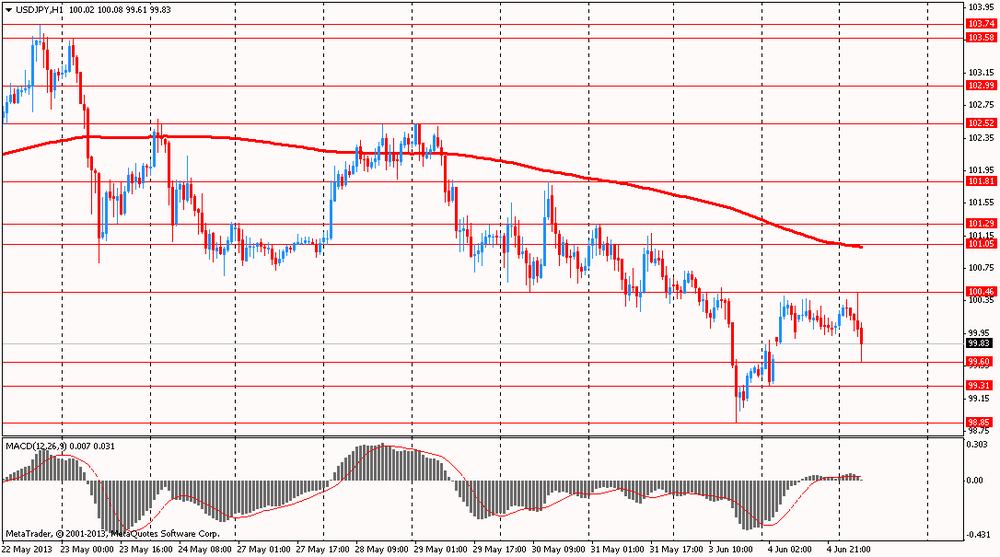 Доллар второй день подряд торговался выше уровня 100 против иены, в ожидании выхода отчета по занятости в США, публикация которого состоится 7 июня. Напомним, что в апреле показатель Nonfarm Payrolls вырос больше, чем прогнозировалось, и составил 165 тыс рабочих мест, а уровень безработицы неожиданно снизился до 7,5%. Аналитики ожидают, что в мае число занятых в несельскохозяйственных отраслях экономики также составит достойное значение. Это может подтолкнуть ФРС к мысли о постепенном сокращении программы количественного смягчения.