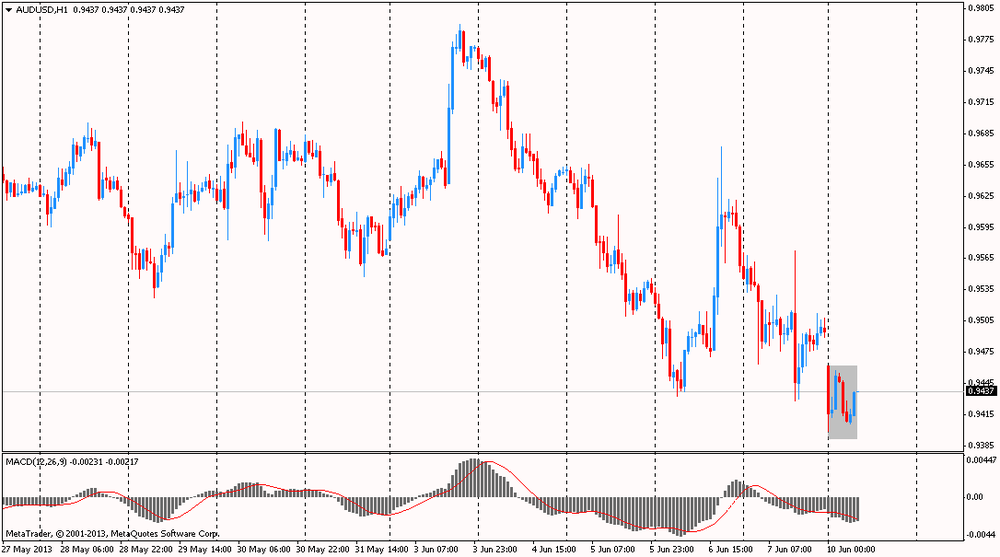 Австралийский доллара упал против коллеги из США после выхода негативной статистики из Китая. Экспорт из КНР вырос в мае 2013 года на 1% в годовом выражении после рост на 14,7% в апреле, свидетельствуют данные Государственного статистического управления Китая. Майский рост был самым слабым за 10 месяцев. Аналитики ожидали, что апрельские данные были завышенными, но прогнозировали более сдержанное падение - до 7%.