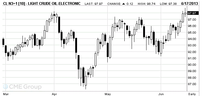 Стоимость июльских фьючерсов на американскую легкую нефть марки WTI (Light Sweet Crude Oil) выросла до 97,97 доллара за баррель на Нью-Йоркской товарной бирже.