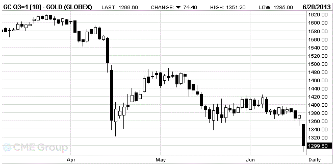 Стоимость золото существенно снизилась, опустившись при этом ниже уровня $1300 за унцию, что произошло впервые почти за три года, так как трейдеры поспешили продать золото, после того, как Федеральная резервная система заявила о вероятном понижении объема своей программы по покупке активов.