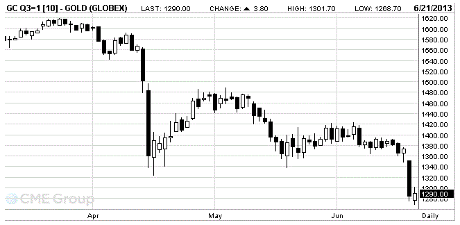 Цены на золото немного выросли, восстановившись при этом с трехлетнего минимума, который был достигнув вчера, тем не менее, все еще остается на пути к своему крупнейшему еженедельному спаду почти за два года. Добавим, что стоимость драгметалла уменьшилась на 7%. Данная динамика была, в первую очередь, связана с заявлением главы Федеральной резервной системы США, который просигнализировал о снижение объема программы по покупке активов уже в этом году, если экономика покажет признаки восстановления.