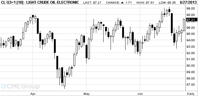 Стоимость августовских фьючерсов на американскую легкую нефть марки WTI (Light Sweet Crude Oil) выросла до 97,41 доллара за баррель на Нью-Йоркской товарной бирже.