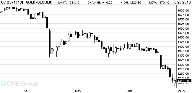 За последнюю неделю спотовая цена снизилась на 15 процентов из-за планов ФРС сократить объем скупки облигаций в этом году, а за второй квартал золото подешевело на 25 процентов, что является худшим показателем с начала ведения статистики в 1968 году.