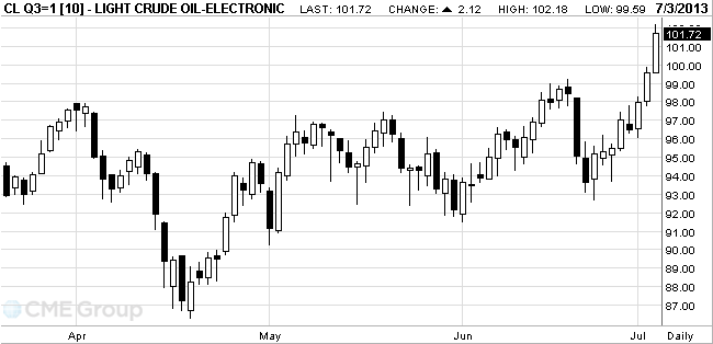 Стоимость августовских фьючерсов на американскую легкую нефть марки WTI (Light Sweet Crude Oil) выросла до 102,18 доллара за баррель, самого высокого внутридневного уровня с 4 мая 2012 года на Нью-Йоркской товарной бирже.