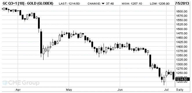Стоимость августовского фьючерса на золото на COMEX упала сегодня до уровня $1214.50 за унцию.