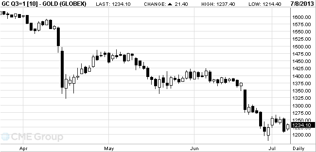 Спотовая цена снизилась на 10 процентов после того, как глава ФРС Бен Бернанке сказал в июне, что темп роста американской экономики позволяет центробанку снизить объем скупки облигаций в этом году. Сокращение стимулов вызовет рост процентных ставок и доллара, сделав золото менее привлекательным для инвесторов за пределами США.