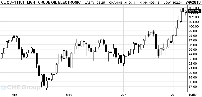 Стоимость августовских фьючерсов на американскую легкую нефть марки WTI (Light Sweet Crude Oil) упала до 102,31 доллара, а потом выросла до 103,48 доллара за баррель на Нью-Йоркской товарной бирже.