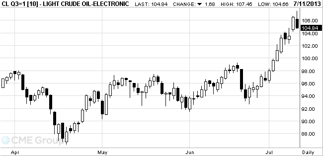 Стоимость августовских фьючерсов на американскую легкую нефть марки WTI (Light Sweet Crude Oil) снизилась до 104,66 доллара за баррель на Нью-Йоркской товарной бирже. Фьючерсы выросли до $107,45 за баррель ранее, это самая высокая внутридневная цена с 27 марта 2012 года