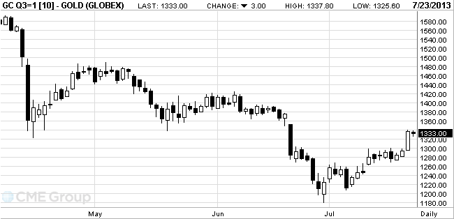 Цены выросли на $150 с зафиксированного 28 июня трехлетнего минимума $1.180,71, так как ФРС США сообщила, что начнет сокращение стимулов только тогда, когда убедится, что это не повредит экономике.
